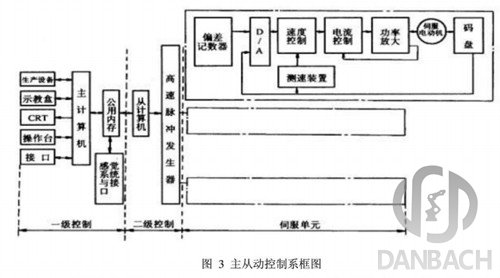 (2) 主從控制系統(tǒng)(Master-slave Control System):采用主、從兩處理器實(shí)現(xiàn)系統(tǒng)的全部控制功能。主CPU(上位機(jī))實(shí)現(xiàn)管理、坐標(biāo)變換、軌跡生成和系統(tǒng)自診斷等;從CPU(下位機(jī))實(shí)現(xiàn)所有關(guān)節(jié)的動(dòng)作控制。其構(gòu)成框圖,如圖3所示。主從控制方式系統(tǒng)實(shí)時(shí)性較好,適于高精度、高速度控制,但其系統(tǒng)擴(kuò)展性較差,維修困難。